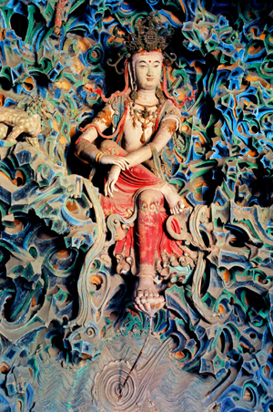最美五彩懸朔觀音像 摩尼殿內(nèi)槽北壁為一座宋代的泥塑五彩懸山,懸山上共有佛像30余身,最引人注目的還是端坐于中間的五彩自在觀音像,俗稱“倒坐觀音”。觀音像高3.4米,左足踏蓮,右腿踞起,兩手抱膝,身體稍向前傾斜,面容秀麗恬靜,姿態(tài)優(yōu)雅端莊。柳眉之下,那雙智慧深邃的眼睛微微俯視,恰與禮佛者仰視時形成感情上的交流。這人性化了的佛像被魯迅先生稱為“東方美神”。