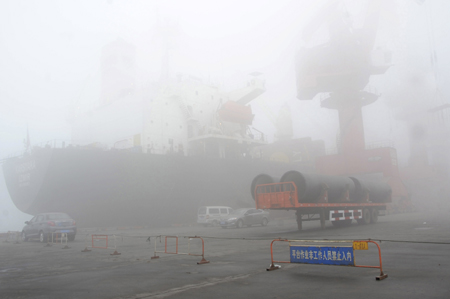 圖為,當(dāng)日一艘大型遠(yuǎn)洋運(yùn)輸輪停泊在連云港港口碼頭等待霧散裝運(yùn)出口貨物。