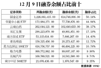 值得注意的是,截至12月9日,國金證券的融券余額占其融資融券余額的比例已經(jīng)達到了50.14%。相比之下,WIND統(tǒng)計數(shù)據(jù)顯示,在12月9日有記錄的713只兩融標的券種當(dāng)中,這個比例位列第一,遠遠超出了其他標的。不僅如此,在這713只標的券種當(dāng)中,有706只的融券占比低于10%。國金證券的這一融券比例,僅有華夏中小板ETF堪與之相比,后者融券占比為44.9%。也就是說,在目前所有兩融標的券種當(dāng)中,國金證券是融資和融券的多空比例最為勢均力敵的標的券種,也是全市場唯一的一只融券余額超出融資余額的標的券種。就兩融的整體市場而言,截至12月9日當(dāng)天,兩融總余額為3346.08億元,融券余額則為39.79億元,融券余額占兩融的比例僅為1.19%。國金證券的融券余額比例已經(jīng)遠遠超出了這一數(shù)量級。
