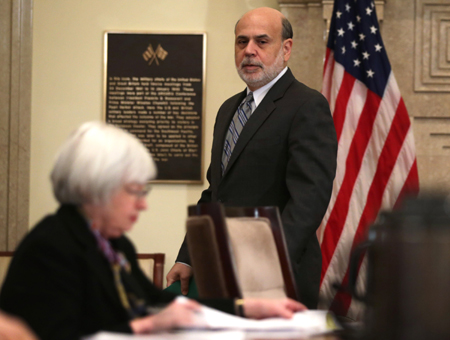 圖為美聯(lián)儲現(xiàn)任主席伯南克(右)和美聯(lián)儲副主席耶倫(左)等候出席10日召開的美聯(lián)儲理事會會議,并對“沃爾克規(guī)則”的最終版本進行討論。