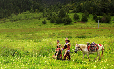 兩位林芝女子牽馬行走在林芝境內(nèi)的“魯朗花!