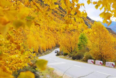 車(chē)輛行駛在秋日里的川藏公路西藏林芝地區(qū)境內(nèi),川藏公路林芝境內(nèi)被譽(yù)為最美景觀大道