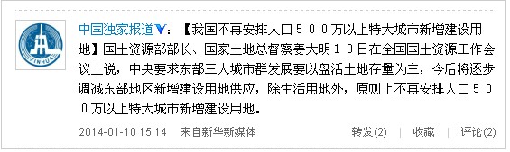 據(jù)新華社對外部中國獨家報道微博1月10日消息,國土資源部部長、國家土地總督察姜大明10日在全國國土資源工作會議上說,中央要求東部三大城市群發(fā)展要以盤活土地存量為主,今后將逐步調(diào)減東部地區(qū)新增建設(shè)用地供應(yīng),除生活用地外,原則上不再安排人口500萬以上特大城市新增建設(shè)用地。