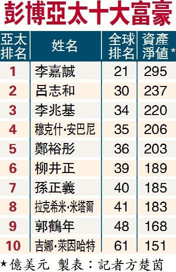 根據(jù)彭博億萬富豪指數(shù)的最新排名,李嘉誠以295億美元仍成為亞洲區(qū)首富,并在彭博的全球富豪榜排名21位;呂志和以237億美元居亞洲第二富,在彭博全球富豪榜中排名第30位。