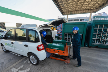 在金華市東關(guān)電動汽車充電站內(nèi),工作人員正在為一輛純電動汽車更換電池。該充電站是目前浙江省規(guī)模最大、設(shè)施最齊全的電動汽車充電站。記者