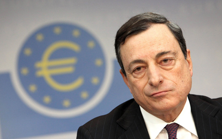 歐洲央行6日宣布,維持當(dāng)前利率政策不變,主導(dǎo)利率依舊保持在0.25%之上。同時(shí),英國央行(英格蘭銀行)宣布,維持當(dāng)前貨幣政策不變,基準(zhǔn)利率仍為0.50%水平,購債規(guī)模為3750億英鎊(約6130億美元)。 圖為歐洲央行行長德拉吉在當(dāng)日舉行的發(fā)布會上表示,歐元區(qū)并未處于通縮當(dāng)中,但歐洲央行會對物價(jià)持續(xù)走低保持警惕。