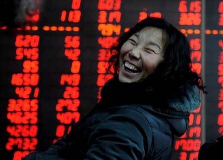 圖為當(dāng)日在沈陽(yáng)一家證券公司股票交易大廳,一名股民笑逐顏開(kāi)。