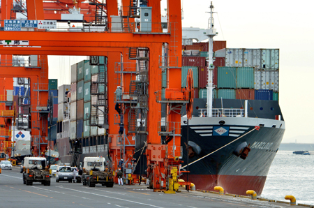 日本10日公布的數(shù)據(jù)顯示,受巨額貿(mào)易逆差拖累,2013年日本國際收支經(jīng)常項(xiàng)目順差額創(chuàng)歷史新低,為3.3061萬億日元,比前一年減少31.5%。數(shù)據(jù)還顯示,經(jīng)季節(jié)調(diào)整后,2013年12月日本國際收支經(jīng)常項(xiàng)目出現(xiàn)1967億日元逆差額,為連續(xù)4個月出現(xiàn)逆差。圖為10日在日本東京的一個貨運(yùn)碼頭,貨輪正在裝載貨物。