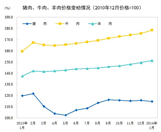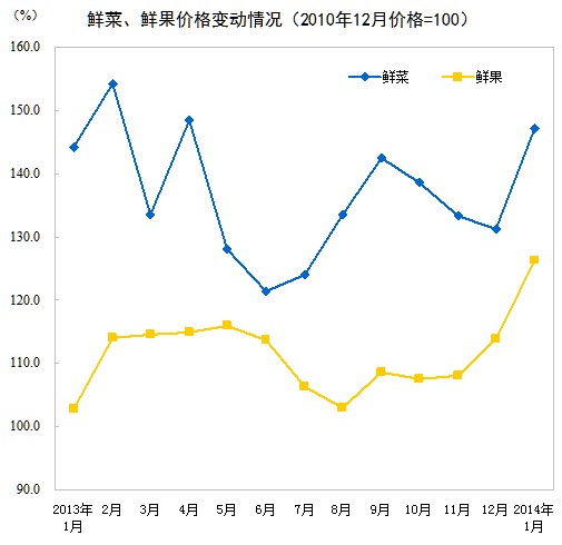 2014年1月份,全國(guó)居民消費(fèi)價(jià)格總水平同比上漲2.5%。其中,城市上漲2.6%,農(nóng)村上漲2.2%;食品價(jià)格上漲3.7%,非食品價(jià)格上漲1.9%;消費(fèi)品價(jià)格上漲2.0%,服務(wù)價(jià)格上漲3.7%。