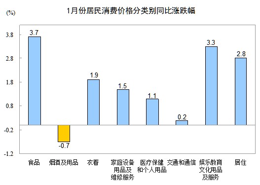 1月份,全國(guó)居民消費(fèi)價(jià)格總水平環(huán)比上漲1.0%。其中,城市上漲1.0%,農(nóng)村上漲0.9%;食品價(jià)格上漲2.4%,非食品價(jià)格上漲0.3%;消費(fèi)品價(jià)格上漲1.1%,服務(wù)價(jià)格上漲0.8%。