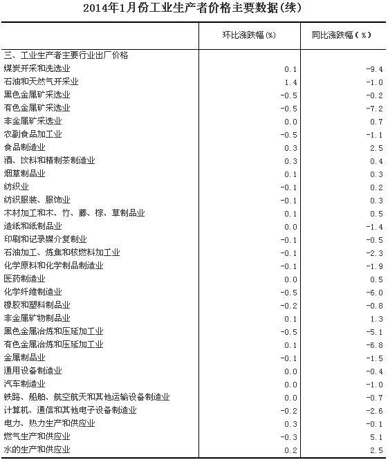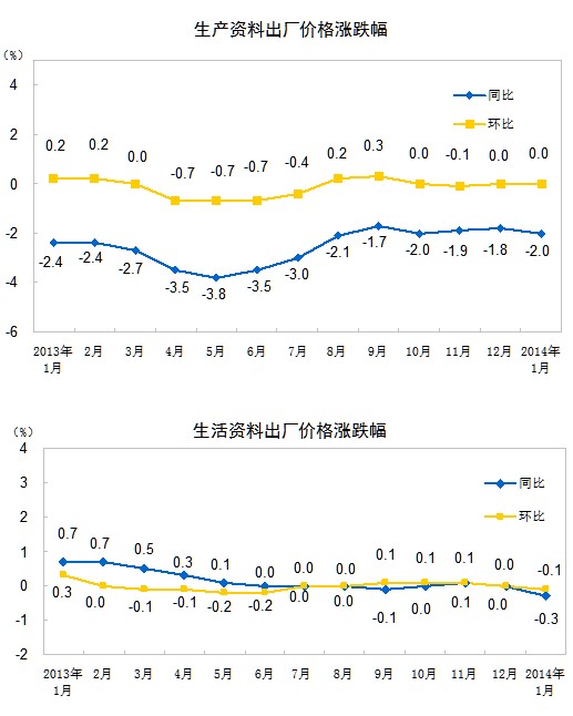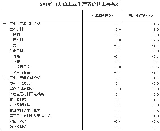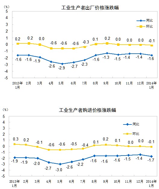 2014年1月份,全國工業(yè)生產(chǎn)者出廠價格同比下降1.6%,環(huán)比下降0.1%。工業(yè)生產(chǎn)者購進(jìn)價格同比下降1.7%,環(huán)比下降0.1%。