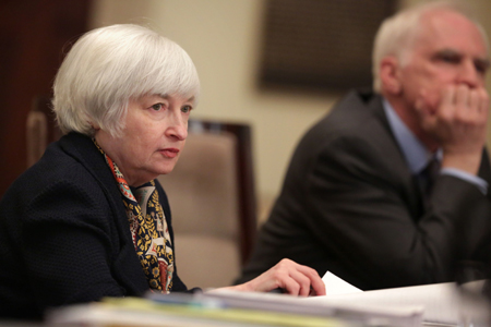 美聯(lián)儲18日正式出臺了加強(qiáng)大型外資銀行監(jiān)管新規(guī),把在美國運(yùn)營的部分大型外資銀行納入和本國大型銀行相同的監(jiān)管框架。 圖為美聯(lián)儲主席耶倫(左)18日在華盛頓出席一次會議。