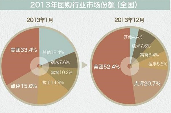 據(jù)團(tuán)800最新數(shù)據(jù),2013年排在前兩位的美團(tuán)和點(diǎn)評在全年整體的市場份額中達(dá)到66.3%,美團(tuán)交易額160億,大眾點(diǎn)評團(tuán)購交易額接近100億。