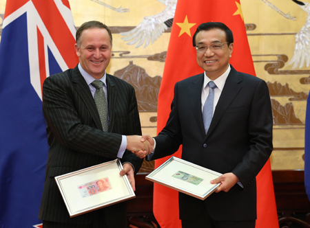 3月18日,國務(wù)院總理李克強(qiáng)在北京人民大會堂同來華進(jìn)行工作訪問的新西蘭總理約翰·基舉行會談。這是會談后,兩國總理共同出席人民幣與新西蘭元直接交易的宣布儀式。中國人民銀行表示,開展人民幣對新西蘭元直接交易,有利于形成人民幣對新西蘭元直接匯率,降低經(jīng)濟(jì)主體匯兌成本,促進(jìn)人民幣與新西蘭元在雙邊貿(mào)易和投資中的使用,有利于中新之間不斷發(fā)展的經(jīng)濟(jì)金融關(guān)系。