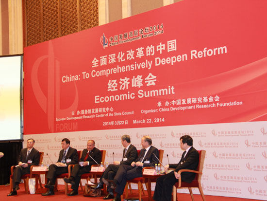 “中國(guó)發(fā)展高層論壇2014”于3月22日-24日在釣魚臺(tái)舉行。上圖為投資自由化與企業(yè)走向世界討論。