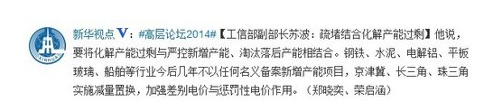 據(jù)新華視點(diǎn)官方微博3月24日消息,工信部副部長蘇波說,要將化解產(chǎn)能過剩與嚴(yán)控新增產(chǎn)能、淘汰落后產(chǎn)能相結(jié)合。鋼鐵、水泥、電解鋁、平板玻璃、船舶等行業(yè)今后幾年不以任何名義備案新增產(chǎn)能項目,京津冀、長三角、珠三角實施減量置換,加強(qiáng)差別電價與懲罰性電價作用。