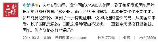新東方董事長(zhǎng)俞敏洪今日在微博上投訴,國(guó)航把其商務(wù)艙換成了經(jīng)濟(jì)艙,而且不給任何解釋,找了國(guó)航無(wú)數(shù)次,國(guó)航以各種理由不退錢(qián)。以下為其微博全文: