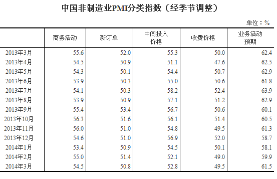 2014年3月,中國非制造業(yè)商務活動指數(shù)為54.5%,高于榮枯線4.5個百分點,但比上月回落0.5個百分點。