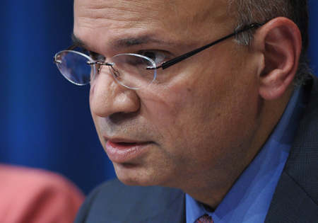 圖為桑吉夫·古普塔9日在IMF華盛頓總部的發(fā)布會上講話。