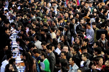 東北大學(xué)2014屆畢業(yè)生春季就業(yè)雙向選擇洽談會(huì)上人頭攢動(dòng)。 新華社發(fā)(張文魁/攝) |