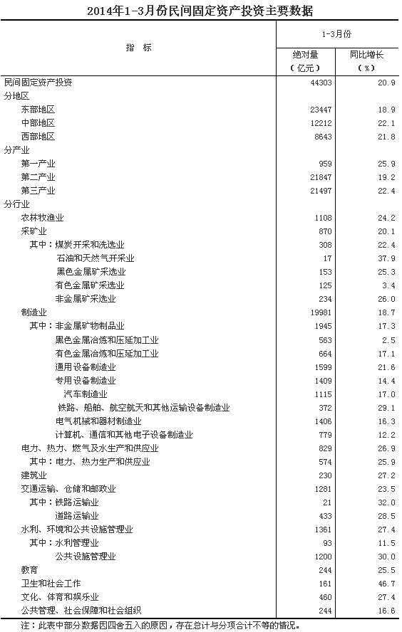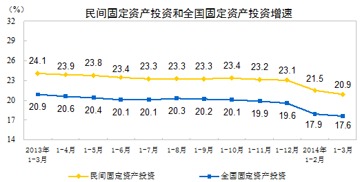 2014年1-3月份,民間固定資產(chǎn)投資44303億元,同比名義增長(zhǎng)20.9%(扣除價(jià)格因素實(shí)際增長(zhǎng)19.6%),增速比1-2月份回落0.6個(gè)百分點(diǎn)。民間固定資產(chǎn)投資占全國(guó)固定資產(chǎn)投資(不含農(nóng)戶)的比重為64.8%。