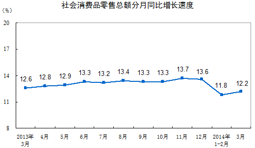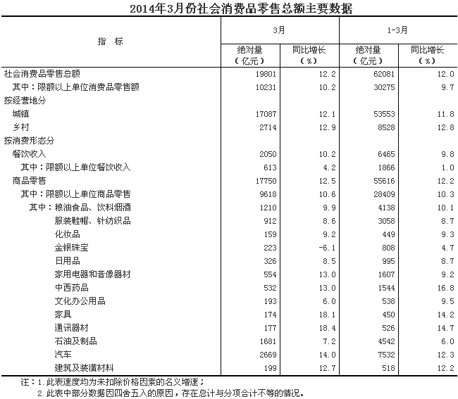 2014年3月份,社會(huì)消費(fèi)品零售總額19801億元,同比名義增長(zhǎng)12.2%(扣除價(jià)格因素實(shí)際增長(zhǎng)10.8%,以下除特殊說(shuō)明外均為名義增長(zhǎng))。其中,限額以上單位消費(fèi)品零售額10231億元,增長(zhǎng)10.2%。1-3月份,社會(huì)消費(fèi)品零售總額62081億元,同比增長(zhǎng)12.0%。其中,限額以上單位網(wǎng)上零售額[1]815億元,增長(zhǎng)51.7%。