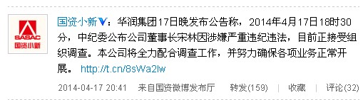 華潤集團(tuán)17日晚發(fā)布公告稱,2014年4月17日18時30分,中紀(jì)委公布公司董事長宋林因涉嫌嚴(yán)重違紀(jì)違法,目前正接受組織調(diào)查。本公司將全力配合調(diào)查工作,并努力確保各項(xiàng)業(yè)務(wù)正常開展。