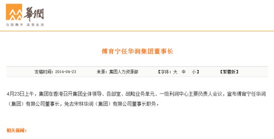 4月23日上午,集團(tuán)在香港召開(kāi)集團(tuán)全體領(lǐng)導(dǎo)、各部室、戰(zhàn)略業(yè)務(wù)單元、一級(jí)利潤(rùn)中心主要負(fù)責(zé)人會(huì)議,宣布傅育寧任華潤(rùn)(集團(tuán))有限公司董事長(zhǎng),免去宋林華潤(rùn)(集團(tuán))有限公司董事長(zhǎng)職務(wù)。