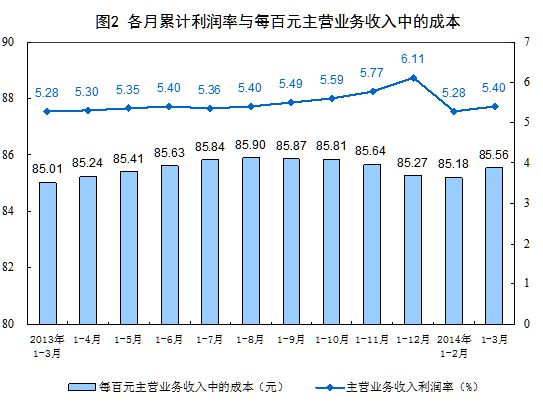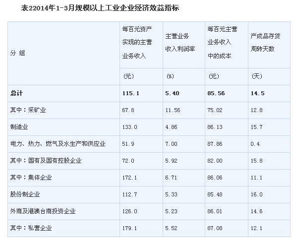 1-3月份,規(guī)模以上工業(yè)企業(yè)主營(yíng)業(yè)務(wù)收入利潤(rùn)率為5.4%,每百元主營(yíng)業(yè)務(wù)收入中的成本為85.56元,每百元資產(chǎn)實(shí)現(xiàn)的主營(yíng)業(yè)務(wù)收入為115.1元,產(chǎn)成品存貨周轉(zhuǎn)天數(shù)為14.5天。
