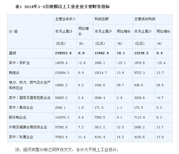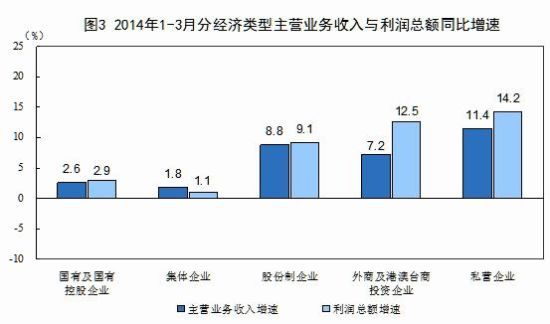 1-3月份,在規(guī)模以上工業(yè)企業(yè)中,國(guó)有及國(guó)有控股企業(yè)實(shí)現(xiàn)利潤(rùn)總額3548.4億元,同比增長(zhǎng)2.9%;集體企業(yè)實(shí)現(xiàn)利潤(rùn)總額171億元,增長(zhǎng)1.1%;股份制企業(yè)實(shí)現(xiàn)利潤(rùn)總額7550.5億元,增長(zhǎng)9.1%;外商及港澳臺(tái)商投資企業(yè)實(shí)現(xiàn)利潤(rùn)總額3011.2億元,增長(zhǎng)12.5%;私營(yíng)企業(yè)實(shí)現(xiàn)利潤(rùn)總額4191.4億元,增長(zhǎng)14.2%。