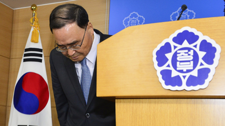 圖為27日在韓國首爾舉行的記者會(huì)上,韓國總理鄭烘原在宣布辭職后鞠躬。