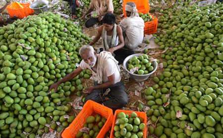 圖為印度果農(nóng)29日在印度海得拉巴一家水果市場上分揀芒果。
