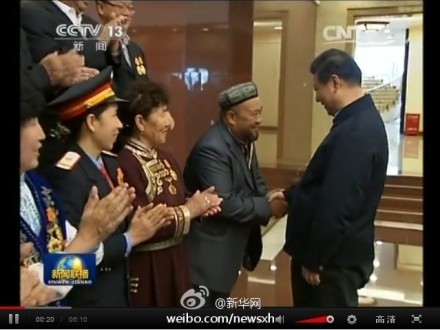 4月30日上午10時許,習(xí)近平和中共中央政治局常委、全國政協(xié)主席俞正聲,在中共中央政治局委員、新疆維吾爾自治區(qū)黨委書記張春賢和自治區(qū)政府主席努爾·白克力陪同下,來到新疆迎賓館10號樓會見廳,接見新疆28名勞動模范和先進(jìn)工作者、先進(jìn)人物代表,同他們親切握手、合影留念,之后同他們進(jìn)行了座談。