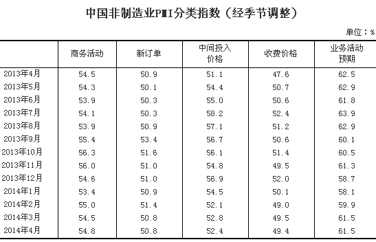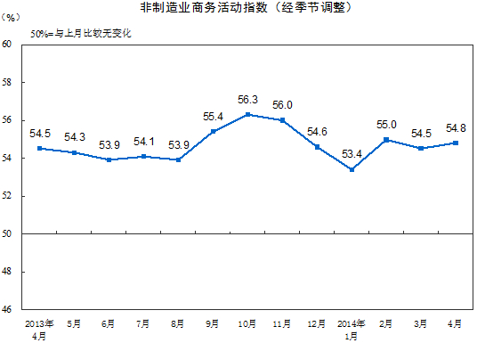 2014年4月,中國非制造業(yè)商務(wù)活動(dòng)指數(shù)為54.8%,比上月上升0.3個(gè)百分點(diǎn),高于榮枯線4.8個(gè)百分點(diǎn)。