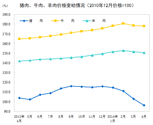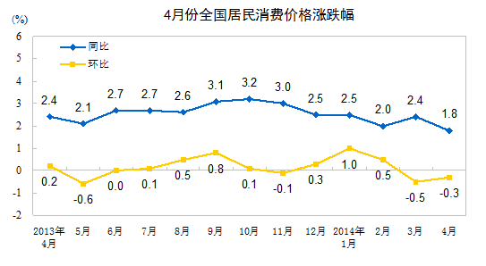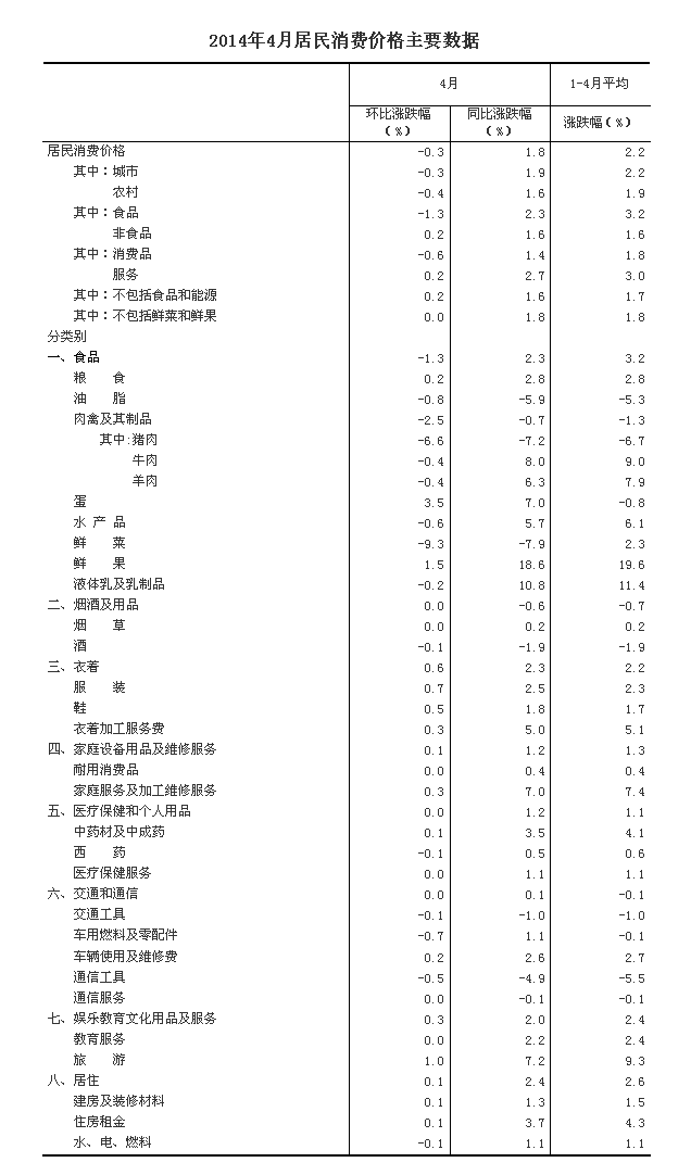 2014年4月份,全國(guó)居民消費(fèi)價(jià)格總水平同比上漲1.8%。其中,城市上漲1.9%,農(nóng)村上漲1.6%;食品價(jià)格上漲2.3%,非食品價(jià)格上漲1.6%;消費(fèi)品價(jià)格上漲1.4%,服務(wù)價(jià)格上漲2.7%。1-4月平均,全國(guó)居民消費(fèi)價(jià)格總水平比去年同期上漲2.2%。