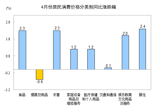 4月份,非食品價(jià)格環(huán)比上漲0.2%。其中,衣著、娛樂教育文化用品及服務(wù)、家庭設(shè)備用品及維修服務(wù)、居住價(jià)格分別上漲0.6%、0.3%、0.1%和0.1%;煙酒及用品、醫(yī)療保健和個(gè)人用品、交通和通信價(jià)格持平(漲跌幅度為0)。