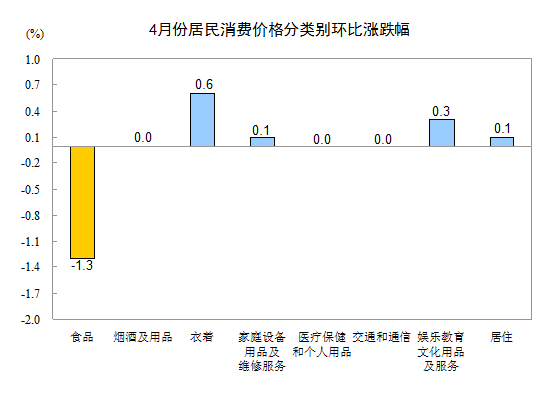 4月份,全國(guó)居民消費(fèi)價(jià)格總水平環(huán)比下降0.3%。其中,城市下降0.3%,農(nóng)村下降0.4%;食品價(jià)格下降1.3%,非食品價(jià)格上漲0.2%;消費(fèi)品價(jià)格下降0.6%,服務(wù)價(jià)格上漲0.2%。