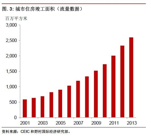 另一種說明這一問題的方式是看房地產(chǎn)市場供需的流量。在供應(yīng)方面,2014 年住房新竣工面積估計為23 億平方米,而在需求方面,預(yù)計城鎮(zhèn)人口增加1,870