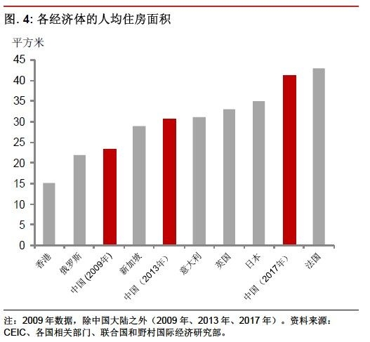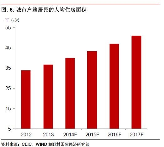 年的23.4平方米上升31%至2013年的30.6平方米。這已經(jīng)接近日本和英國等發(fā)達(dá)經(jīng)濟(jì)體的水平。如果按目前房地產(chǎn)投資趨勢繼續(xù),人均住房建筑面積將在2017年達(dá)到41.2平方米,大幅高于日本和英國2009年的水平。