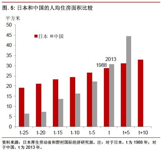 日本也是在其“經(jīng)濟(jì)奇跡”時期經(jīng)歷了住房面積的快速上升(圖5)。人均住房面積從1978年的24平方米上升至1988年的29平方米,隨后日本在1989年遭遇金融危機(jī),房地產(chǎn)泡沫破滅。今天的中國和20世紀(jì)80年代[最新消息價格戶型點評]末的日本有著相似之處,這應(yīng)該引起我們的警惕。我們估計中國人均住房面積也在2013年跨過日本1988的水平(約30平方米)。