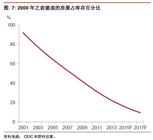 反對存在供應(yīng)過剩問題的另一種普遍說法是,雖然有大量房屋庫存,但是庫存質(zhì)量很低,因此優(yōu)質(zhì)房地產(chǎn)的供應(yīng)仍然有限。這種觀點認(rèn)為目前相當(dāng)大比例的房屋均建于上世紀(jì)90年代;許多人認(rèn)為該等房屋庫存的質(zhì)量低劣,因此業(yè)主可能需要升級,將產(chǎn)生新的房地產(chǎn)需求。