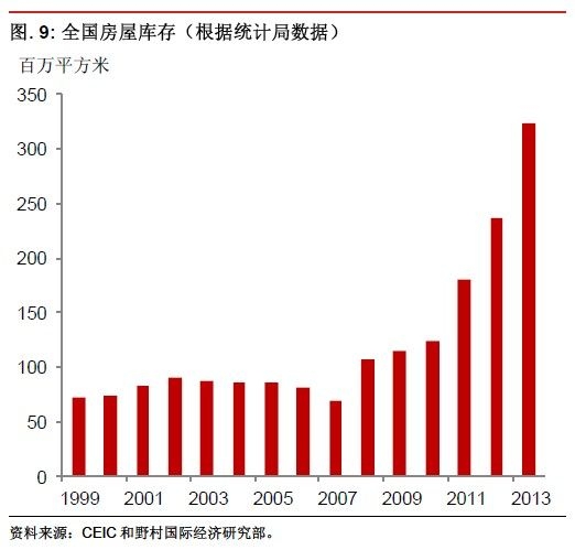 房地產(chǎn)行業(yè)投資過剩的典型后果是庫存迅速累積。這一現(xiàn)象在中國的確存在。官方數(shù)據(jù)顯示,全國房屋庫存在2009 年之前較為穩(wěn)定,但自此開始至2013
