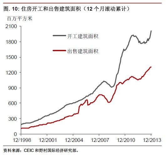 衡量庫存的另一種方式是對比開工建筑面積和出售建筑面積。自2009