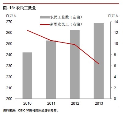 日)。其中特別引人關(guān)注的因素是新增農(nóng)民工數(shù)量從2010 年的1,250 萬下降到了2013年的630