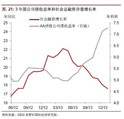 近年來,金融自由化一直是政府的目標(biāo),近期政策已經(jīng)使得利率更有彈性,并推動理財產(chǎn)品規(guī)模大幅增長。中國人民銀行行長周小川在今年3月11日全國人大的記者招待會上表示存款利率自由化可能在未來1-2年內(nèi)實現(xiàn)。周行長根據(jù)國際經(jīng)驗還預(yù)期利率自由化后利率會上升。確實,利率部分市場化已經(jīng)導(dǎo)致利率上升了(圖21).