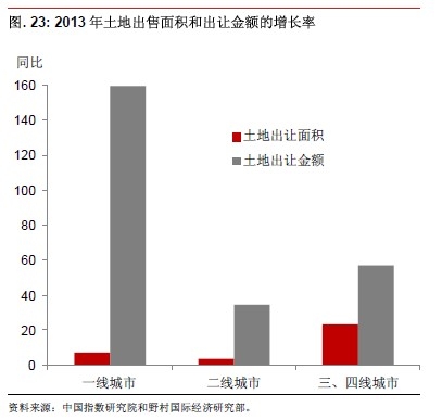 2013年土地出讓金增長了52.4%,首次突破人民幣4萬億元。我們估計,從出讓面積來看,一線城市土地出讓面積增長7.0%,二線城市增長3.7%,三線和四線城市增長23.2%(圖23)。土地出讓金額則分別增長了159.3%、34.2%和57.0%。土地出讓金大幅增長,一定程度上表明了地方政府為緩解融資平臺資金壓力而提高土地出讓規(guī)模的沖動。但土地出讓面積的增加造成房屋供應(yīng)量增加,并造成供需失衡問題進(jìn)一步惡化。