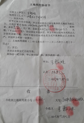 “大中礦業(yè)占我80畝地,雖然協(xié)議寫(xiě)的是租用,實(shí)質(zhì)上是征用,是國(guó)家明令禁止的‘以租代征’,80畝耕地給我的補(bǔ)償總計(jì)只有14萬(wàn)多元,補(bǔ)償價(jià)格遠(yuǎn)低于政府規(guī)定的標(biāo)準(zhǔn),我們現(xiàn)在生活都存在問(wèn)題!贝迕裢醺f(shuō)。根據(jù)王根旺與大中礦業(yè)簽定的《土地租用協(xié)議》顯示,大中礦業(yè)租用王根旺80畝土地,合計(jì)總金額140453元,其中洪地(即水澆地)73.7畝,每畝1803元;旱地6.3畝,每畝1202元;土地租用期限為2007年6月至2028年12月31日。