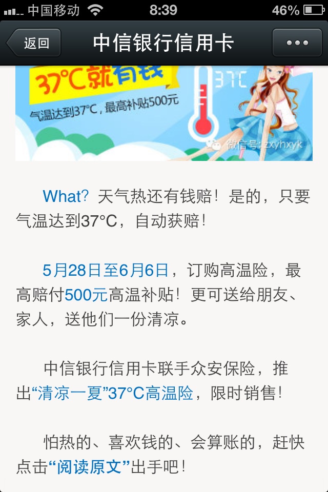 在其產(chǎn)品介紹中,眾安保險如此描述“37℃高溫險”:2014.6.21—2014.8.23(24節(jié)氣的夏至到處暑)期間,如被保險人所在城市出現(xiàn)的37℃高溫日天數(shù)超過合同約定的免賠天數(shù)后,每出現(xiàn)一個37℃高溫日,保險公司按照每份5元/天給付保險金,累計不超過100元/份,每份保單10元最初投入,每個人最多可以買99份。