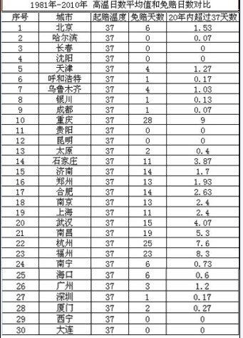 對比中國氣象頻道氣象分析師信欣提供的1981年-2010年,30個城市6月21日-8月23日期間,37以上的高溫日數(shù)和免賠日數(shù)的數(shù)據(jù)表,小伙伴徹底驚呆,原來,論“喜歡錢”和“會算賬”,人家真的甩你好幾條街。
