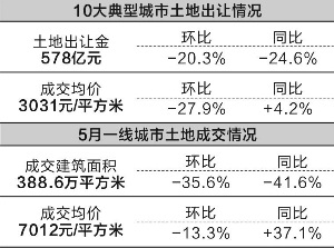摘要:5月份一線城市土地成交建筑面積創(chuàng)近兩年來新低,二線典型城市土地成交同比也是量價齊跌。預計今年上半年,10大典型城市土地出讓金收入同比仍將保持大幅增長。